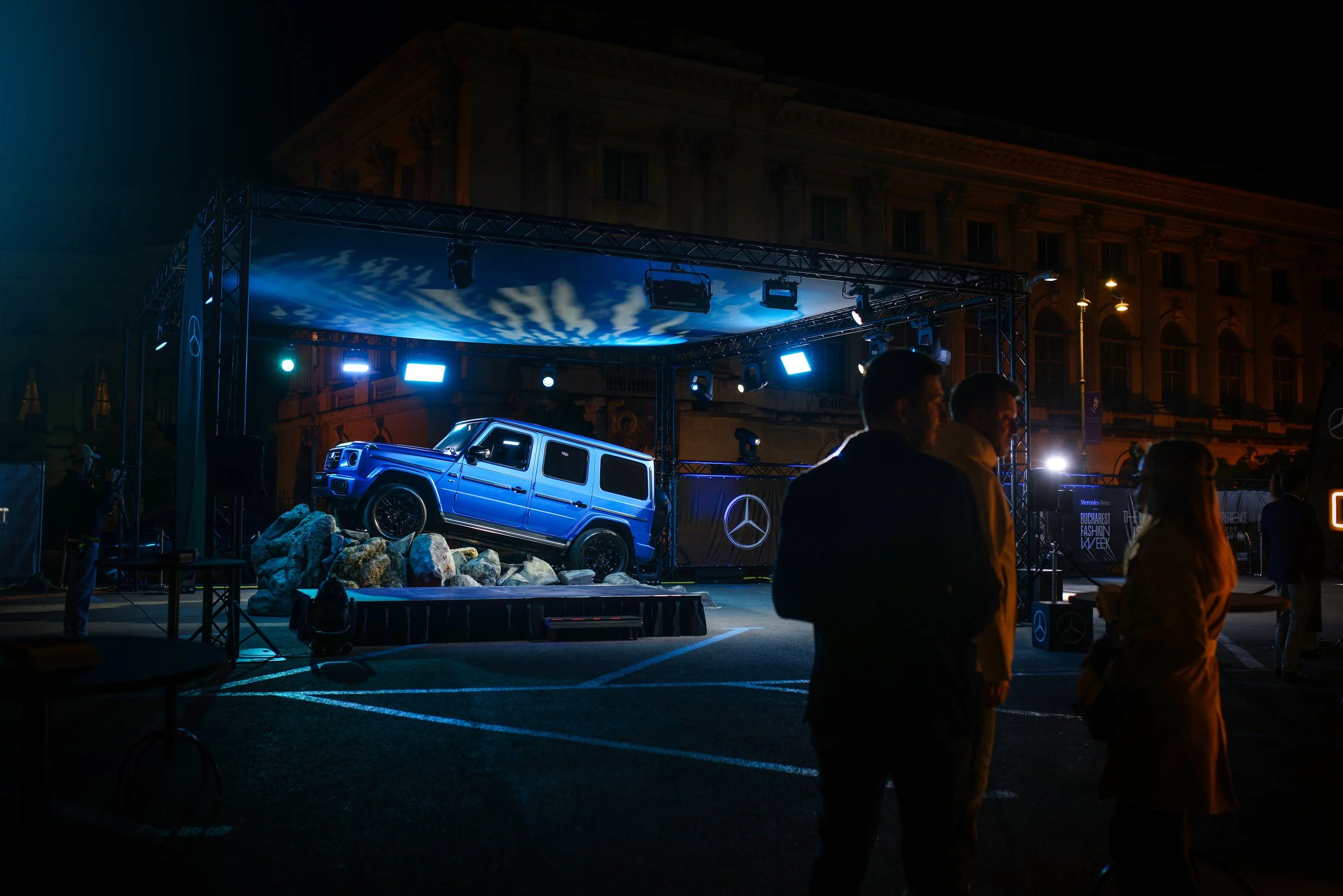 The "Dressed in Art" installation reimagined the history of luxury through a celebrity-inspired photo exhibition, weaving narratives of timeless style with the design excellence of Mercedes-Benz. The centerpiece—a futuristic Maybach expo—stood as a testament to innovation and elegance, while the S-Class display at Athénée Palace Café evoked a dreamlike ambiance with flowing textiles and curated menus.
